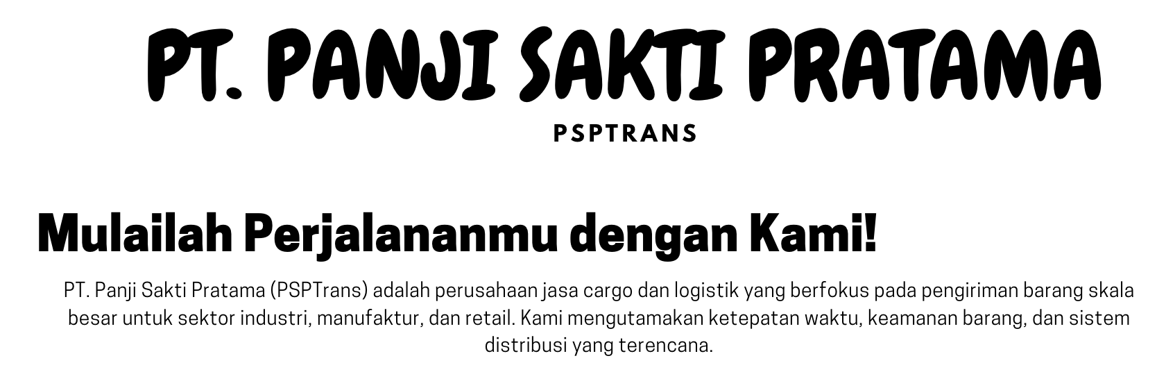 Setiap perjalanan dimulai dengan satulangkah, danbagi PT Panji Sakti Pratama langkah itu adalah komitmen untuk menghadirkan solusi logistik yang handal, efisien dan berkelanjutan. Sejak berdiri, kami telah menjadi mitra strategis bagi berbagai sektor industri di indonesia dari manufaktur, agribisnis, food & beverages hingga distribusi nasional dengan satu tujuan utama yaitu Menyederhanakan Rantai Pasok Agar Bisnis Klien Kami Dapat Bergerak Lebih Cepat Dan Lebih Jauh.